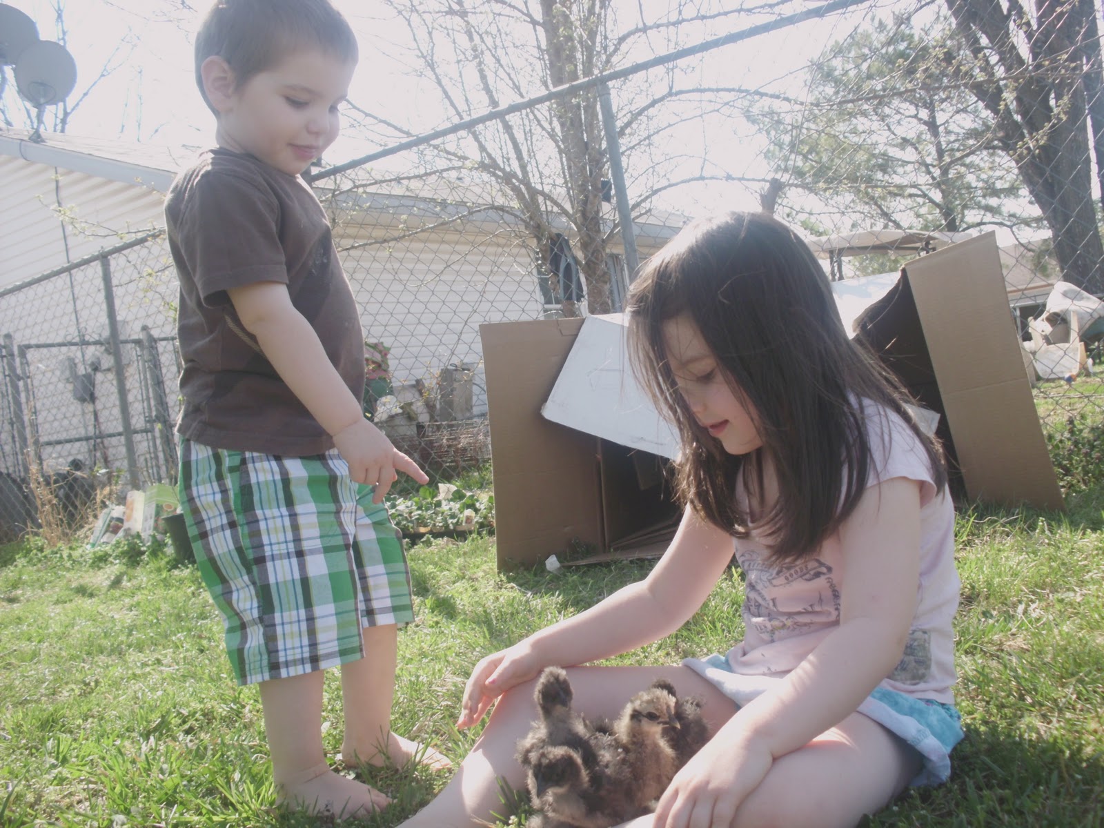 So, we pull up to this 200 acre cattle ranch to get the chicks. The wife, Elaine, runs a daycare out of her home and is so good with the kids. In fact, the reason she HAS chickens is so that the kids she watches can see them hatch and play with them. So cute. She kept the chickens in her well house, which had walls lined with home canned foods covered in cobwebs. When Kate saw the chicks, she started grabbing, one at a time, and putting each one in our box. I had to stop her and explain that these were mommy's chickens too, and that I got to pick at least one AND that we weren't taking ALL of them. We had practiced holding baby chicks at Tractor Supply earlier today, so I was faaaaairly certain that neither she, nor Jack, would squeeze the poor little buggers to death.